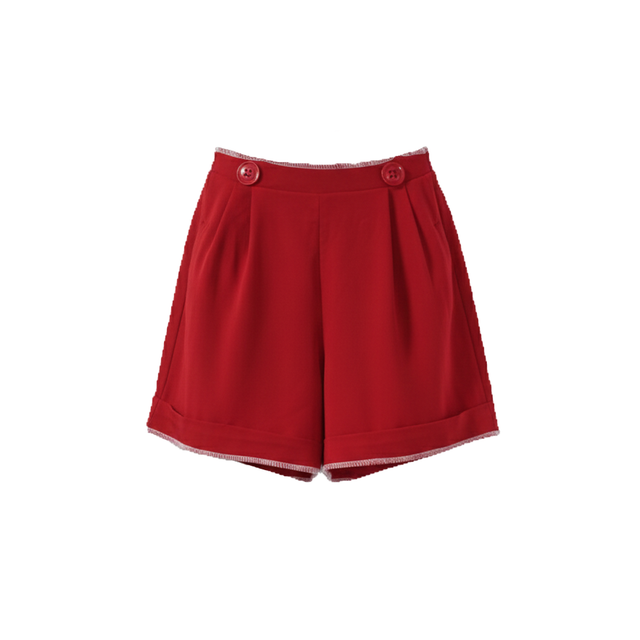 - DETAILS: CONTRAST WHITE OVERLOCK STITCHING ALONG THE WAISTBAND AND CUFFED HEMS; DUAL OVERSIZED TONAL RED BUTTONS; LARGE-SCALE WHITE FIRE EXTINGUISHER SCHEMATIC PRINTED ACROSS THE BACK