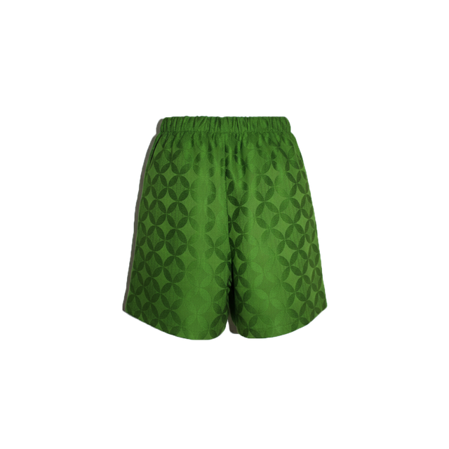 DETAILS: FULLY ELASTICATED WAISTBAND FOR ADJUSTABLE COMFORT; TONAL GREEN JACQUARD-STYLE TEXTURE WITH LASER CUT CIRCULAR LOGO ON LOWER LEFT HEM