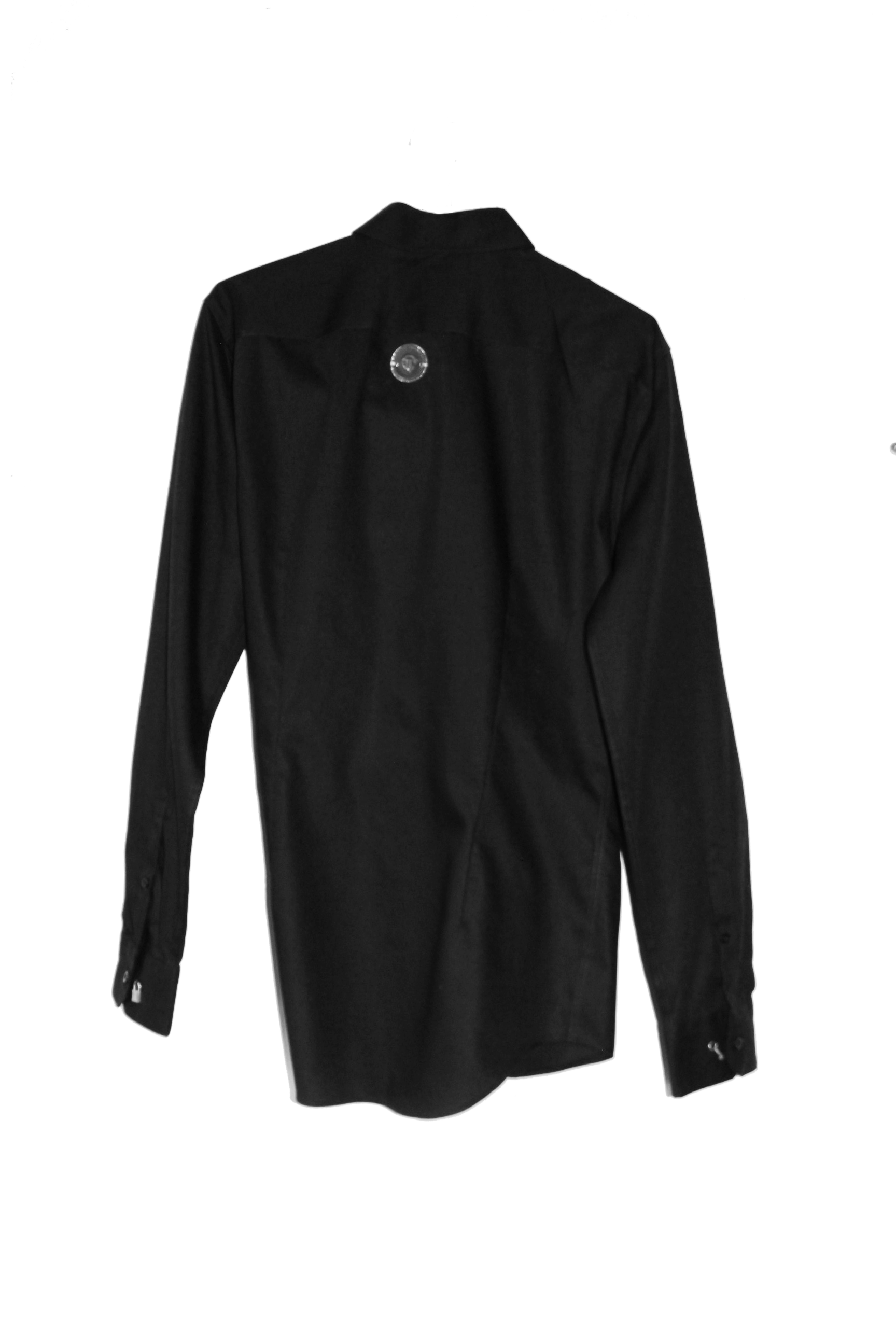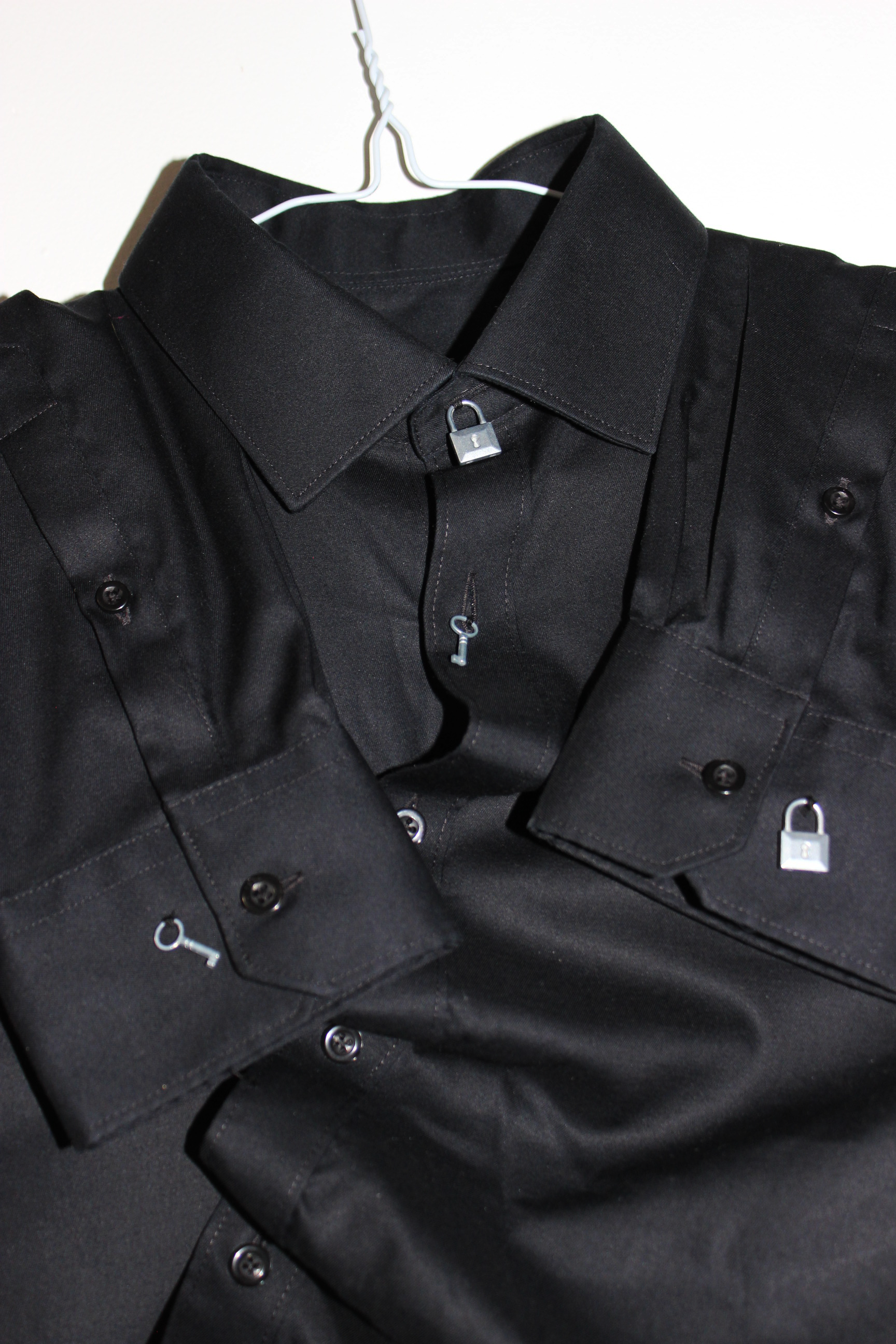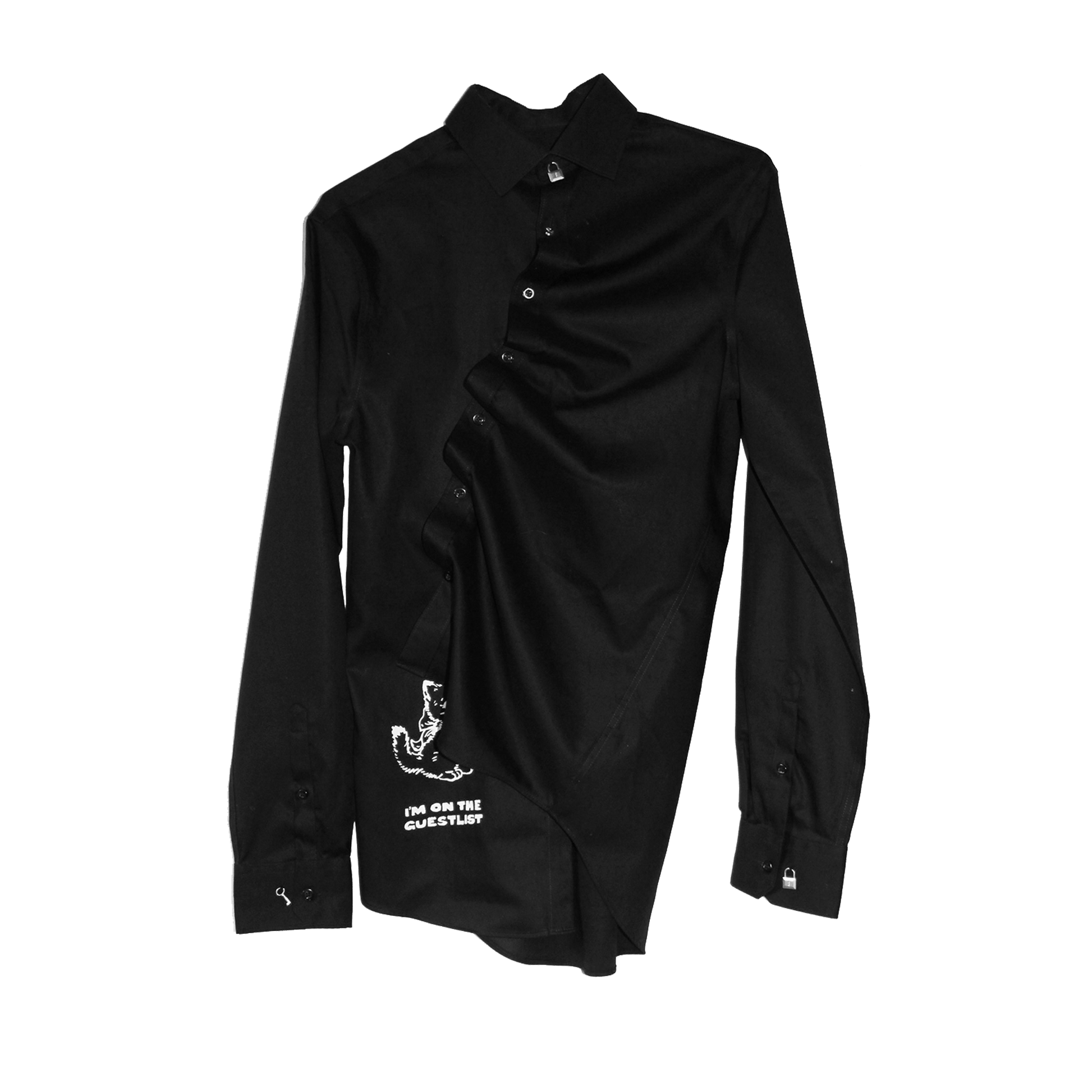 This deconstructed black shirt features an asymmetrical cut with scattered lock and key vintage embellishments throughout. The bold "I'M ON THE GUESTLIST" graphic adds attitude, while the uneven hemline creates an effortlessly edgy silhouette.