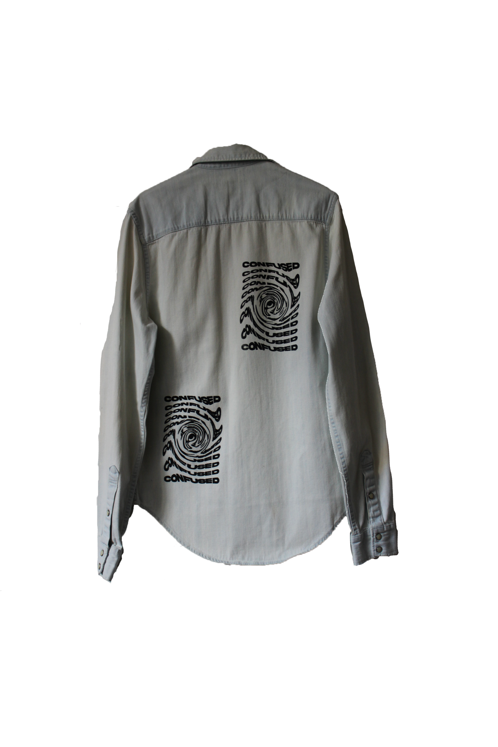 This vintage light denim shirt features custom "CONFUSED" screen printing with hypnotic spiral motifs and classic Western styling. The relaxed fit has been elevated with black graphic details and subtle brand elements for a contemporary streetwear aesthetic that bridges vintage workwear and modern graphics.