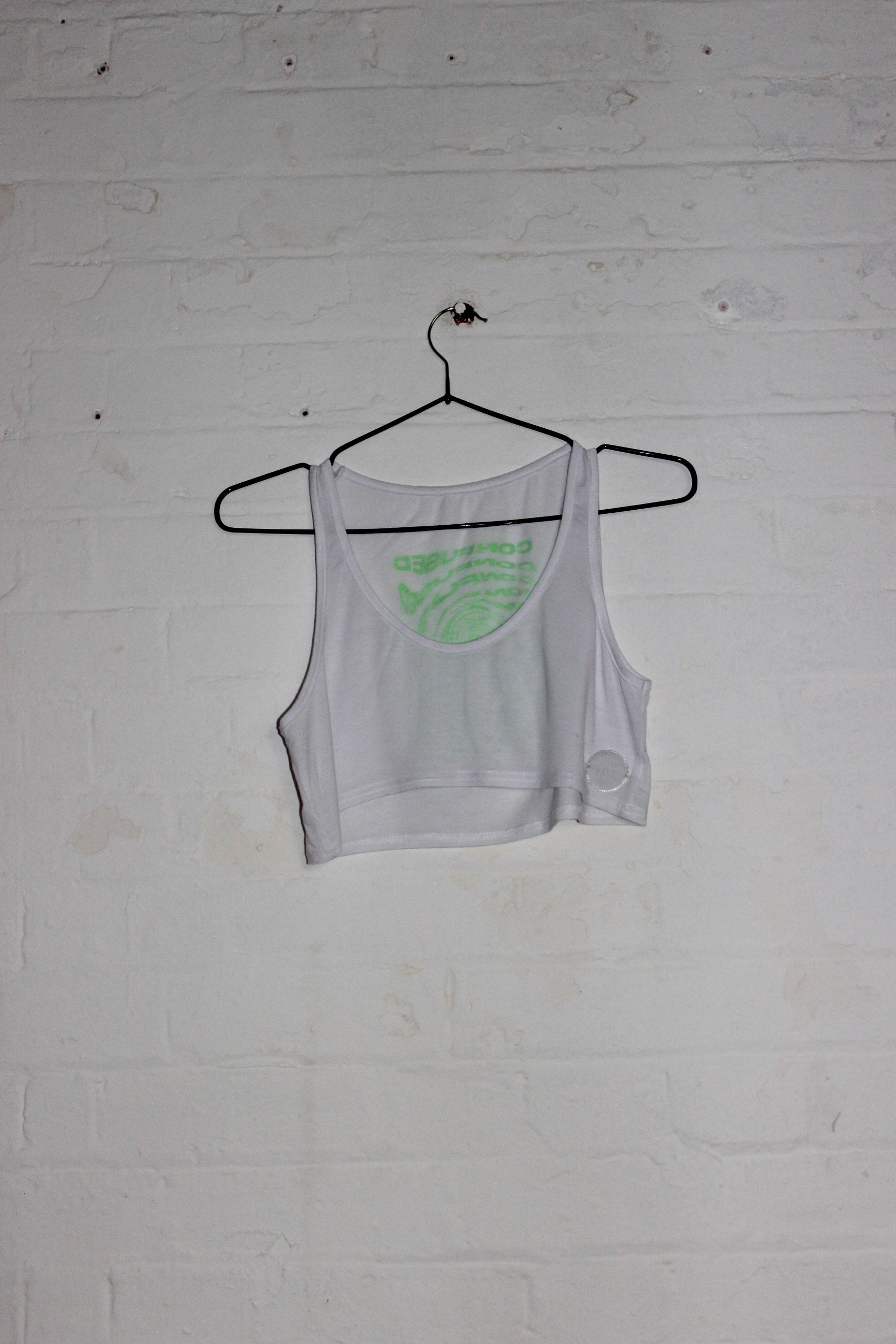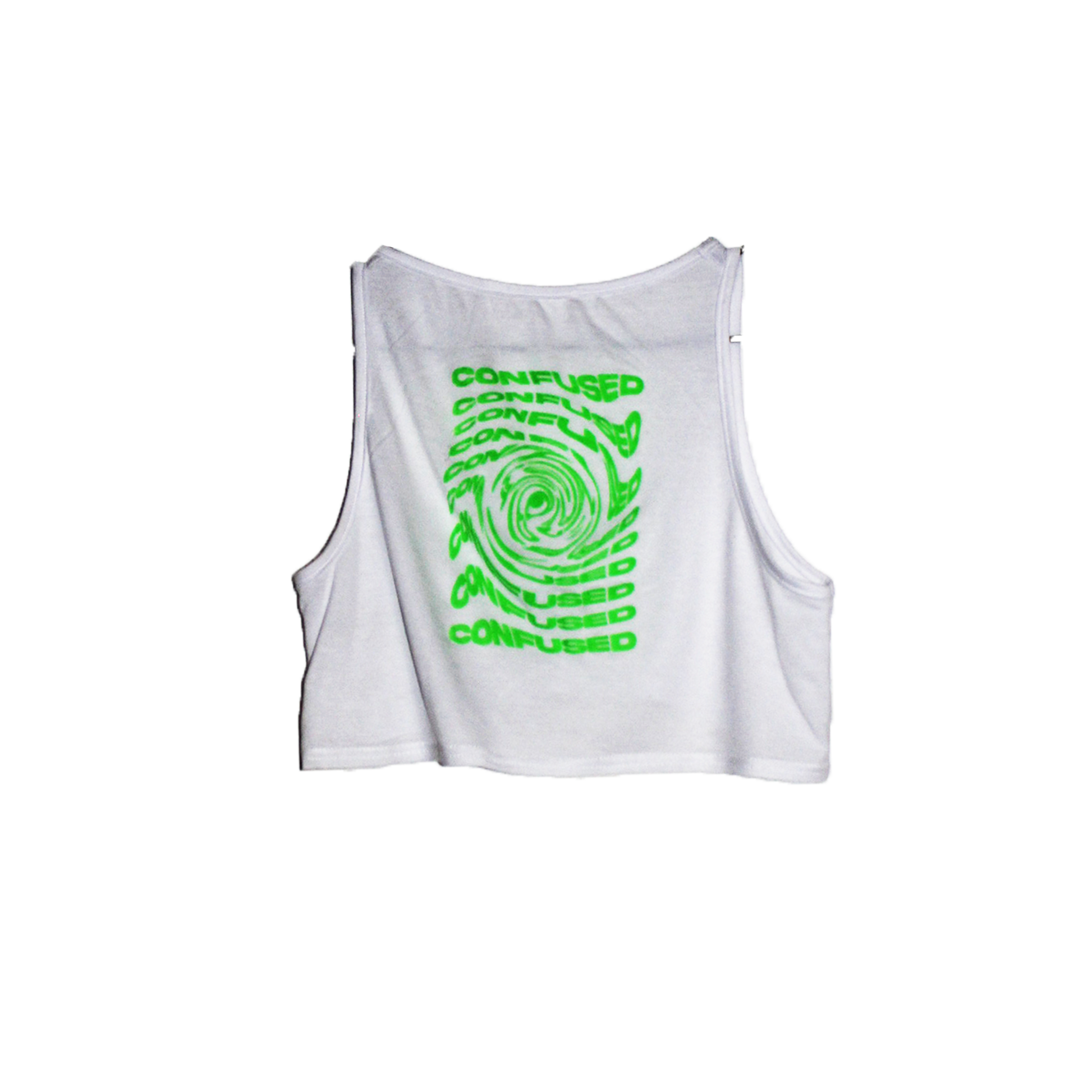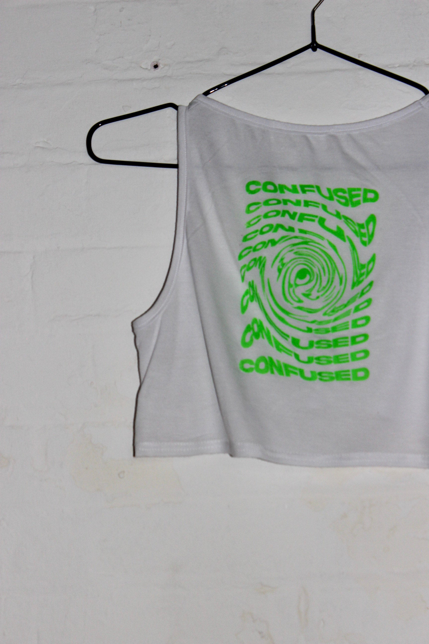 This preloved top found its way to us with stories already sewn into the seams. We screenprinted an original "CONFUSED" design, that glows in UV light.