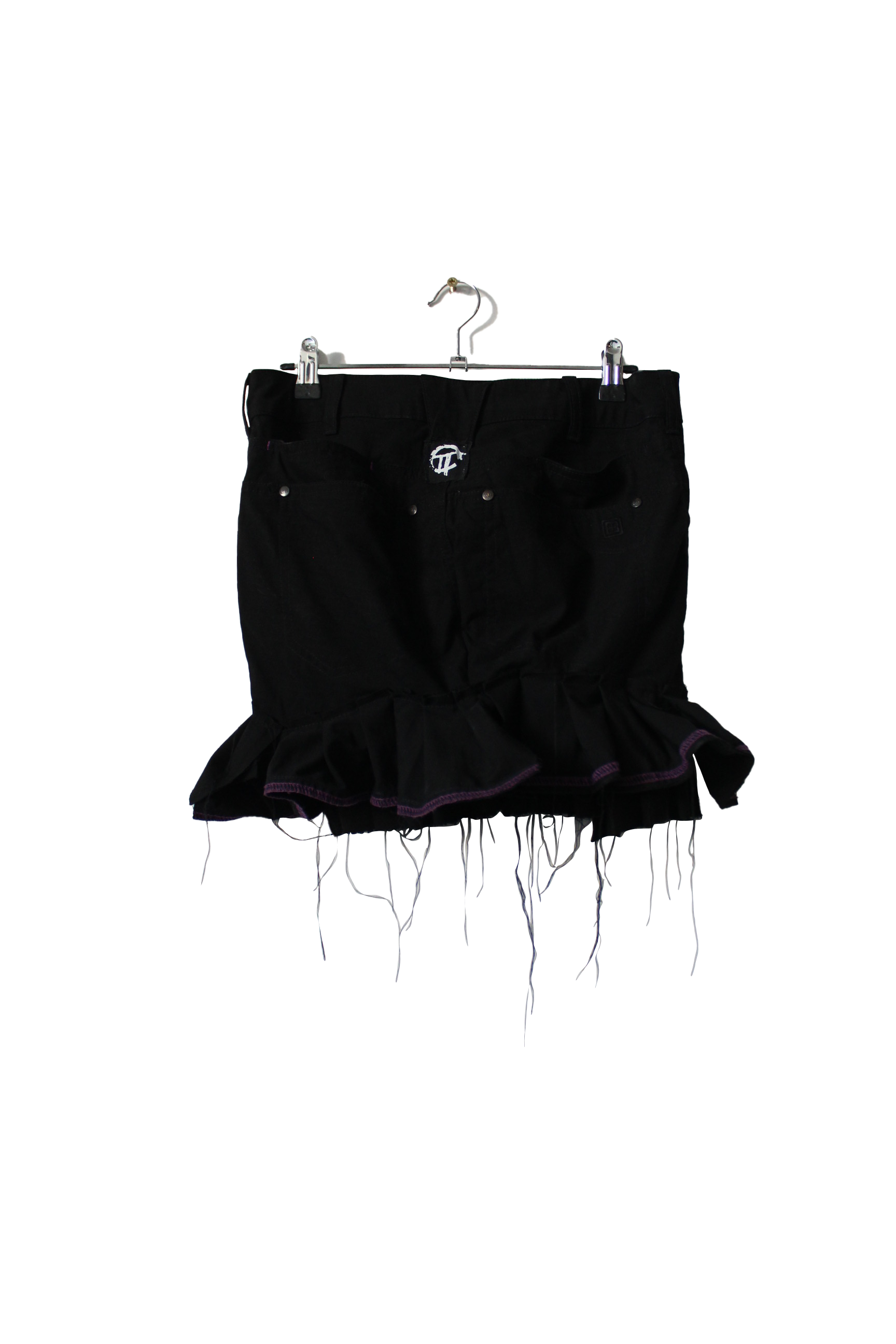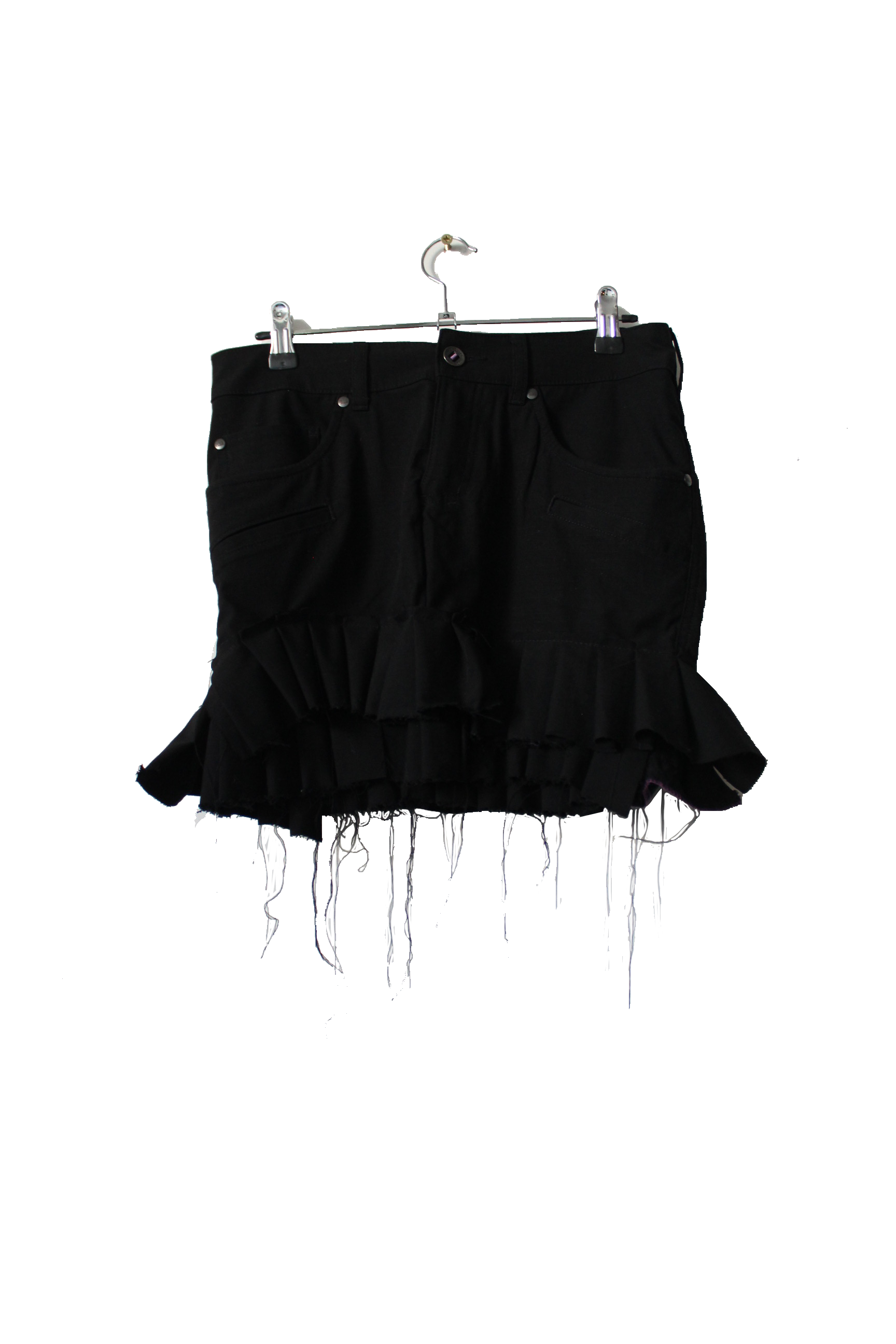 This black mini skirt has been transformed from pre-loved trousers, creating a unique piece that bridges classic menswear and contemporary feminine silhouettes. The original trouser waistband and pocket details have been preserved while adding dramatic tiered ruffles for movement and texture.