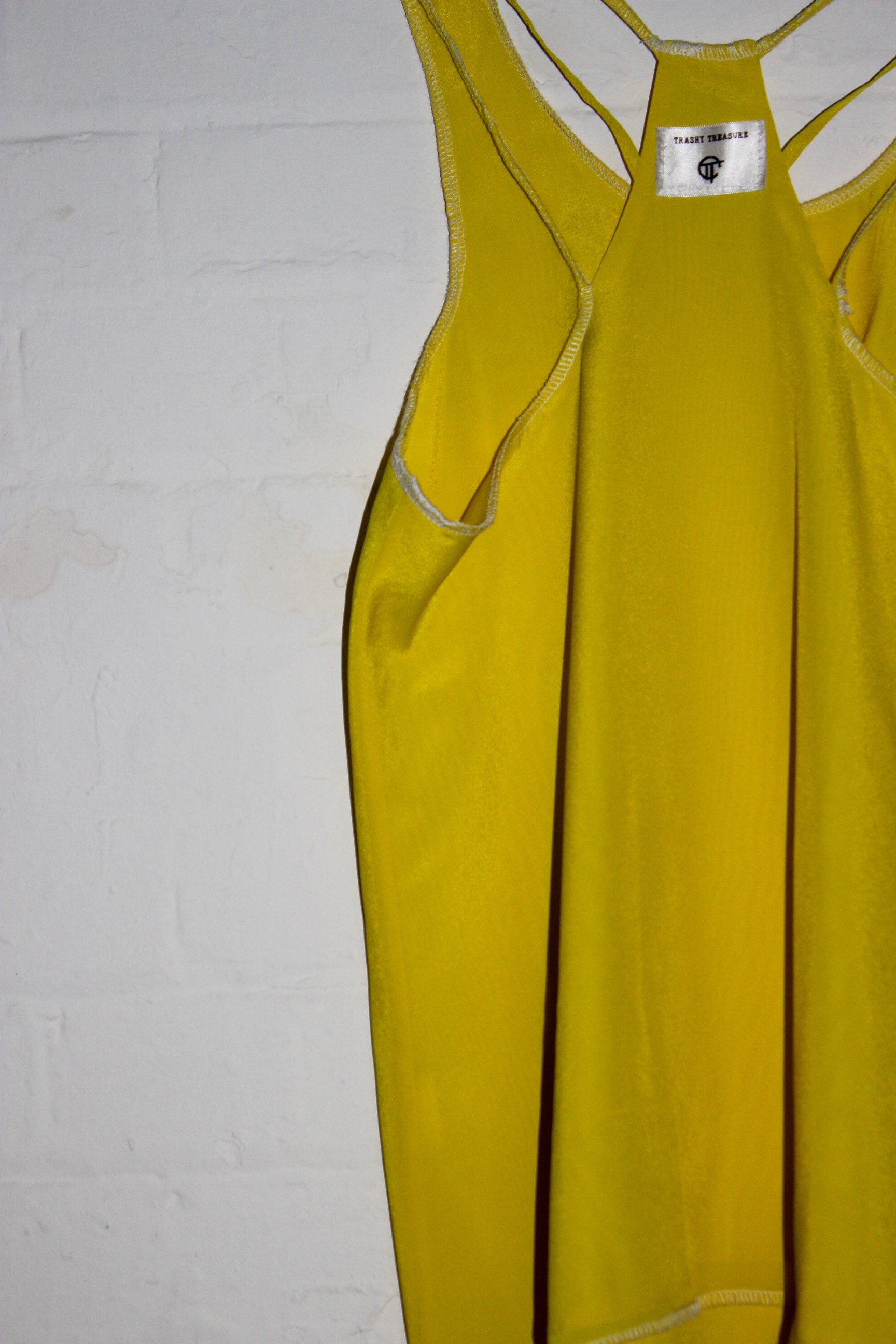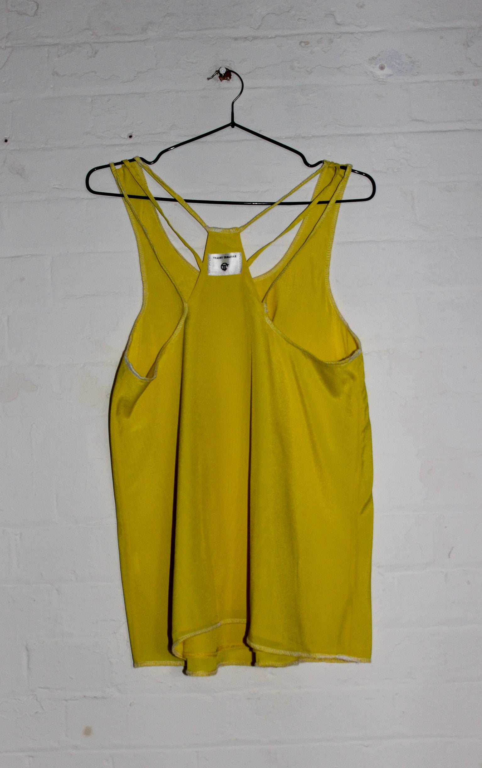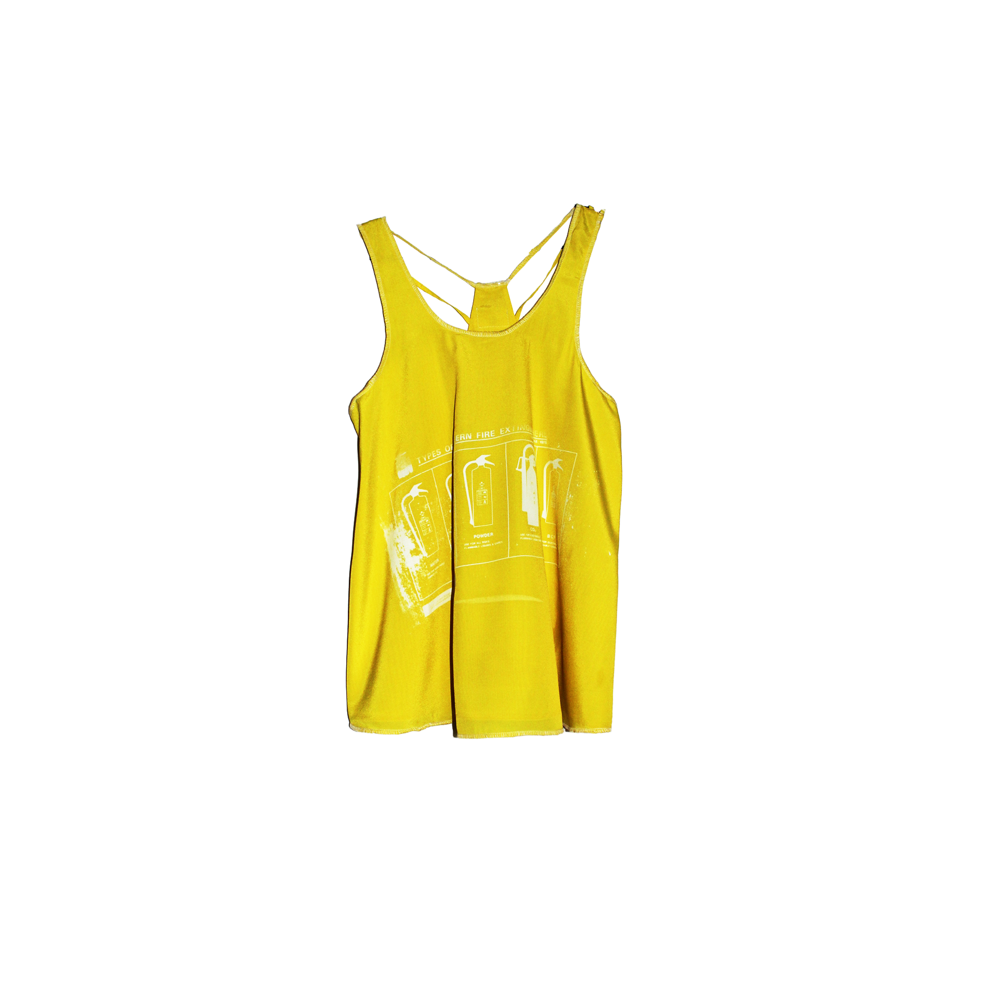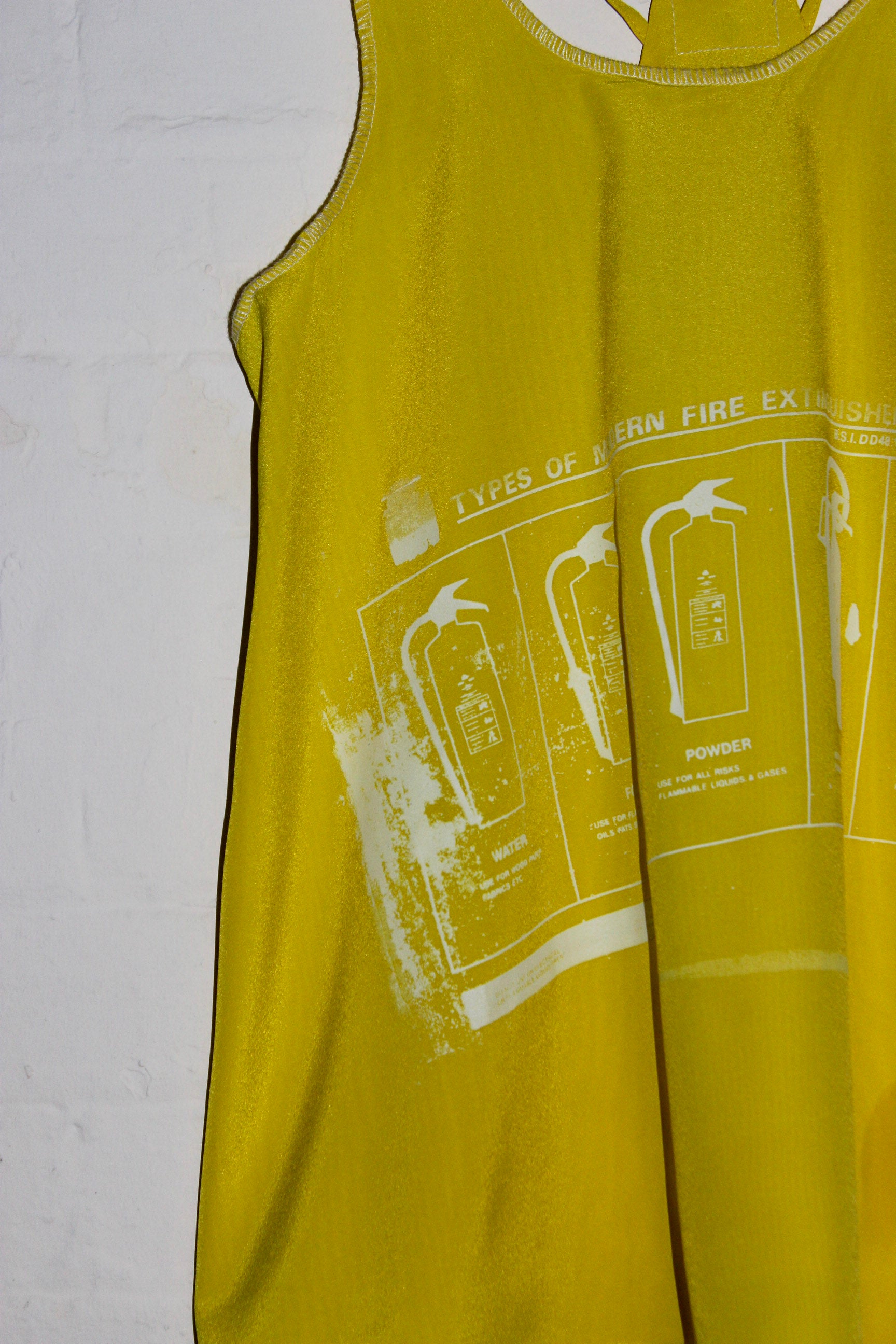 Classic meets punk in this preloved yellow top. The graphic shows different types of fire extinguishersthat I found in my appartment from a past tenant.