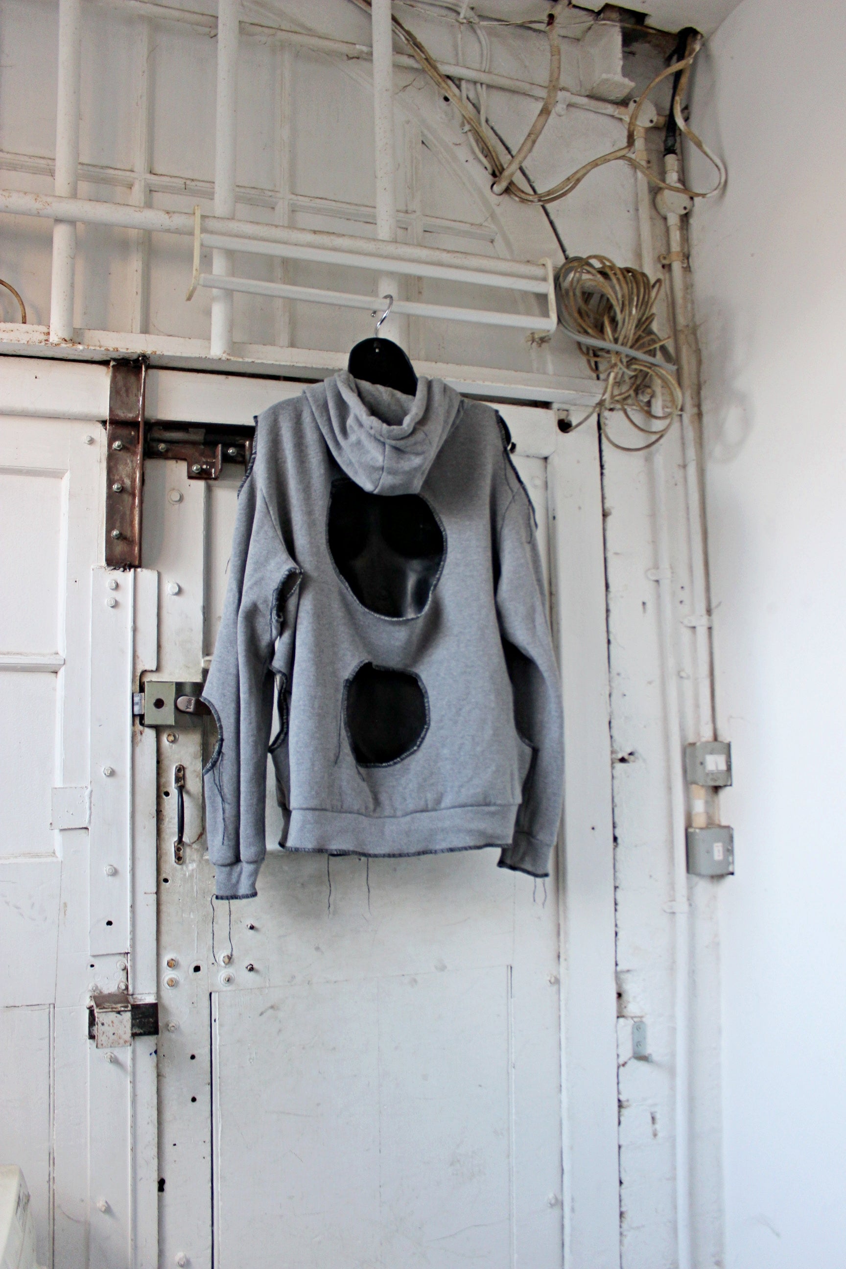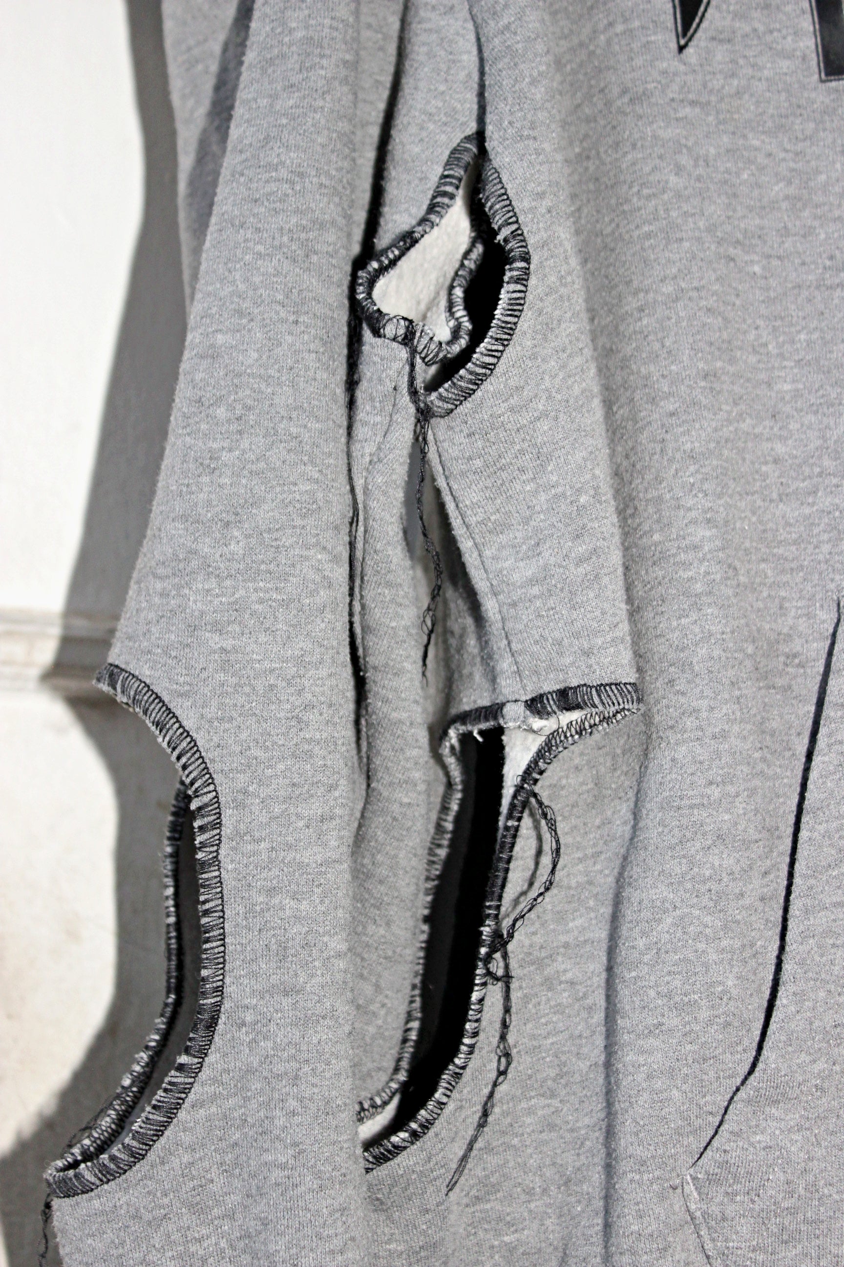 A bold, one-of-a-kind upcycled sweatshirt, reworked from a second-hand piece for a raw, edgy look. Wear it solo for a statement vibe or layer it with something underneath for extra style.