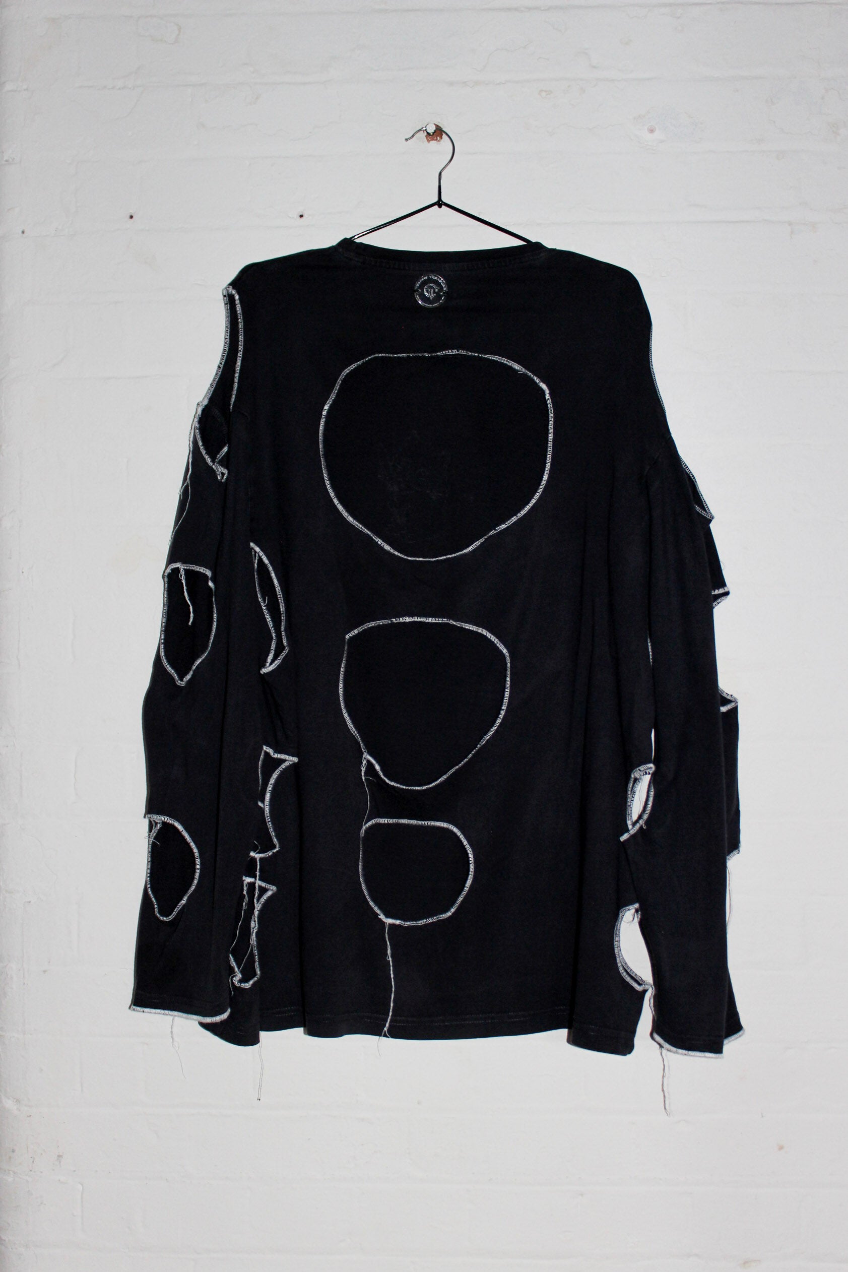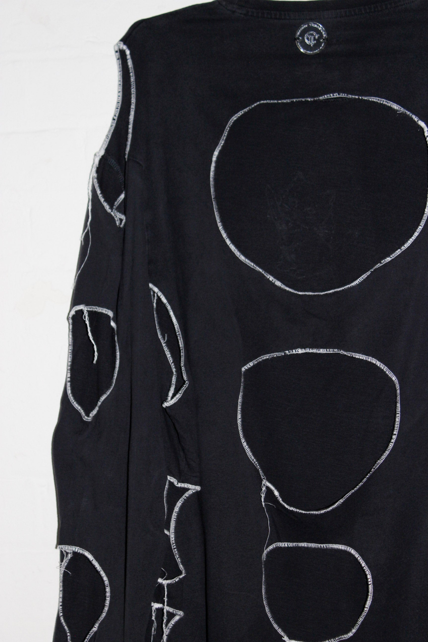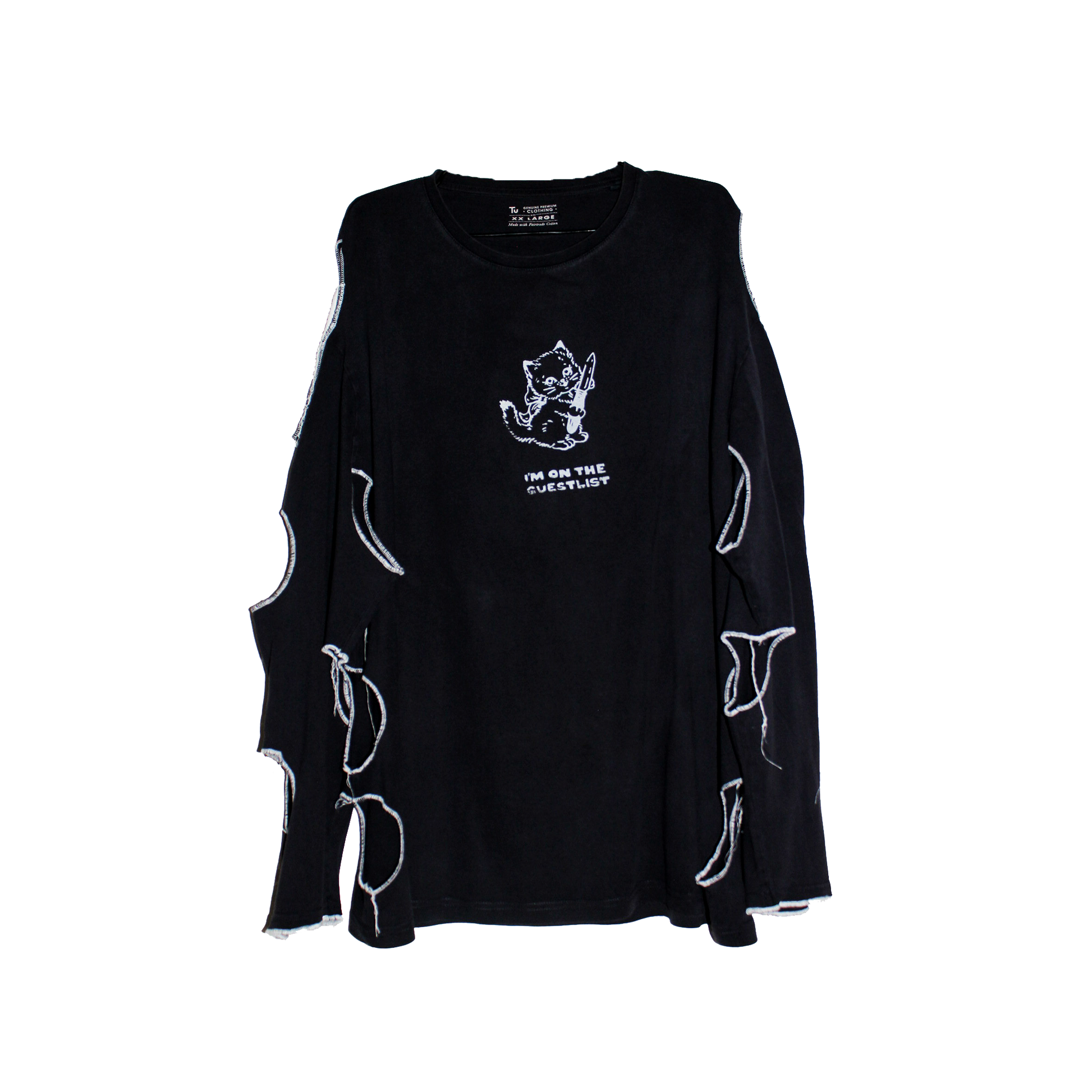 For those who belong everywhere and nowhere all at once. This piece started as a simple black long sleeve, but we gave it the full treatment. Cut-outs that let your skin breathe, a mischievous cat who knows exactly where the party is. Wear it solo to show off your sexy back or tattoos, or layer it over your favorite pieces. Either way, you're definitely on the guestlist.