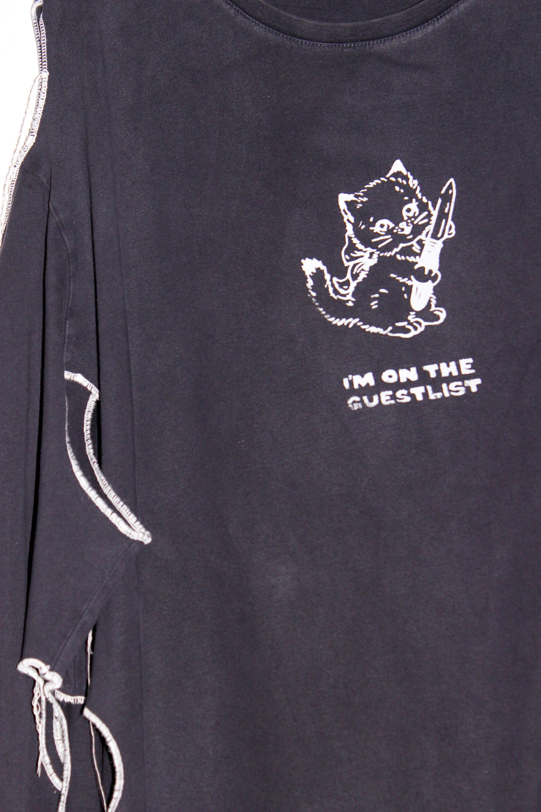 Composition: 100% Cotton jersey, medium weight Fit: Relaxed, unisex oversized Sizes: M-L (fits 36-42" chest comfortably) Colors: Black with white screen print Features: Multiple overlocked circular cut-outs, screen-printed cat graphic with "I'M ON THE GUESTLIST" text Construction: Professional overlocking on all cut-out edges for durability Styling: Perfect worn alone or as a layering piece Care: Machine wash cold inside out, air dry (protects screen print) Weight: 200gsm cotton jersey